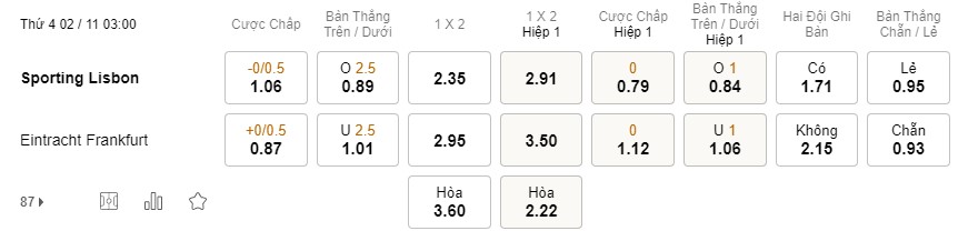 Tỉ lệ kèo Sporting Lisbon vs Frankfurt