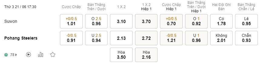 Soi kèo châu Á Suwon vs Pohang Steelers: 1.01*0/0.5*0.91