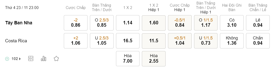Tỉ lệ kèo Tây Ban Nha vs Costa Rica