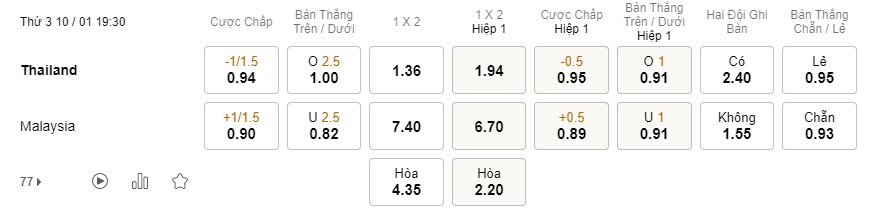 Tỉ lệ kèo Thái Lan vs Malaysia