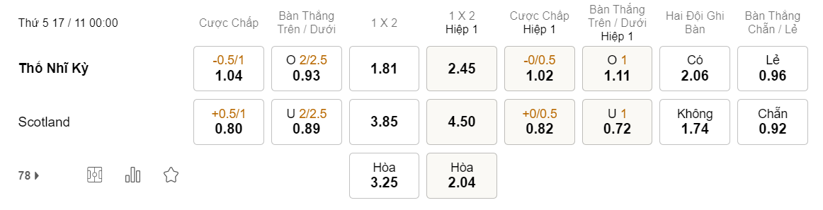 Tỉ lệ kèo Thổ Nhĩ Kỳ vs Scotland