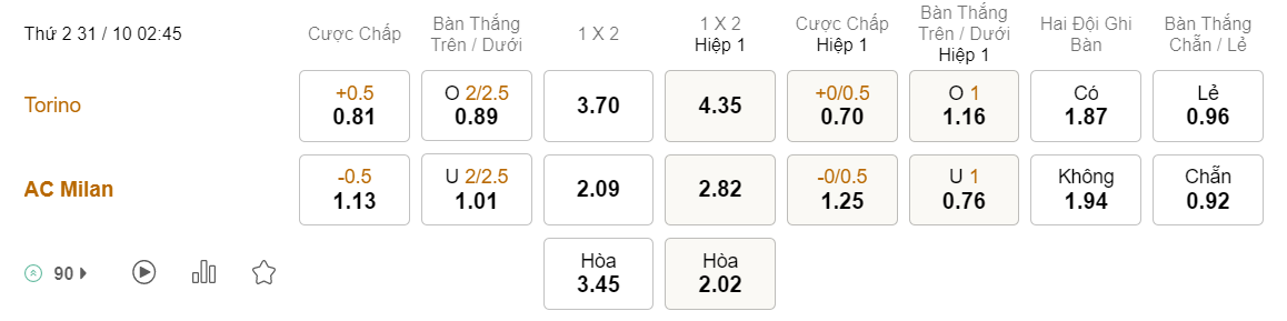 Soi kèo tài xỉu Torino vs Milan: 0.89*2/2.5*1.01