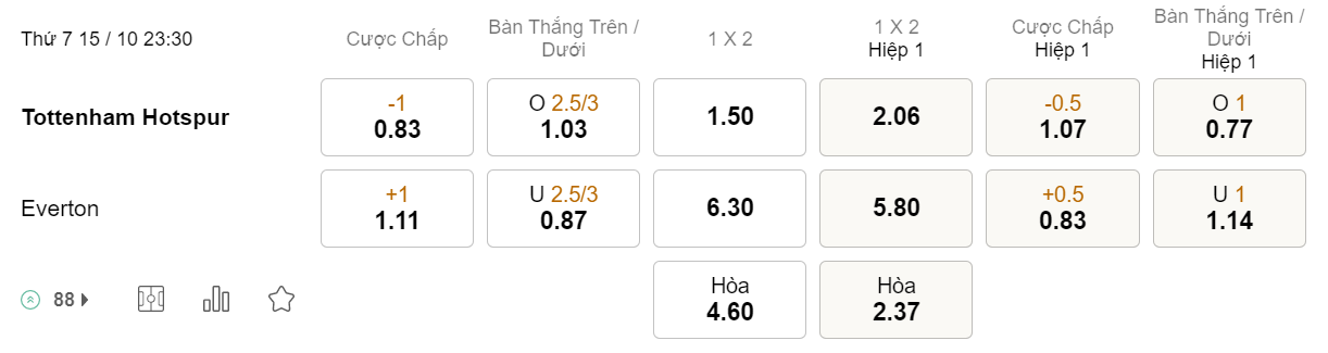 Soi kèo hiệp 1 Tottenham vs Everton: 1.07*0.5*0.83