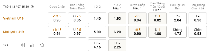 Tỉ lệ kèo U19 Việt Nam vs U19 Malaysia