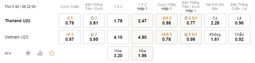 Soi kèo hiệp 1 U23 Thái Lan vs U23 Việt Nam: 0.98*0/0.5*0.78