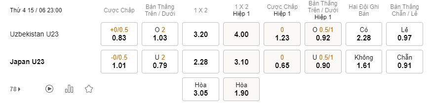 Soi kèo hiệp 1 U23 Uzbekistan vs U23 Nhật Bản: 1.23*0*0.65