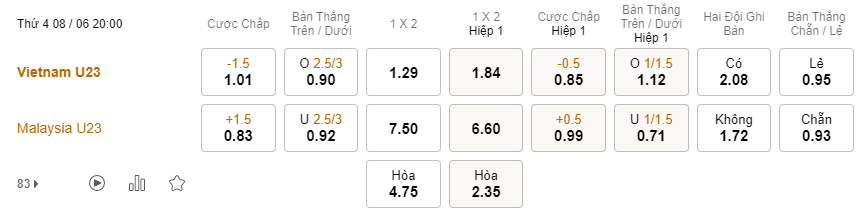 Soi kèo châu Á U23 Việt Nam vs U23 Malaysia: 1.01*1.5*0.83
