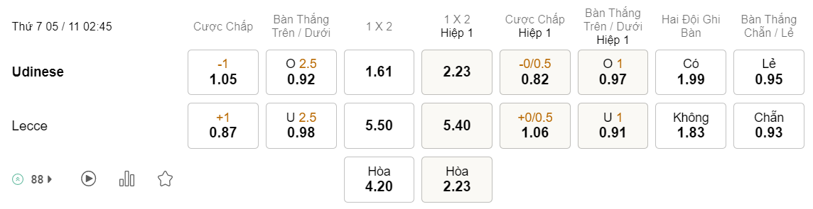 Soi kèo châu Á Udinese vs Lecce: 1.05*1*0.87