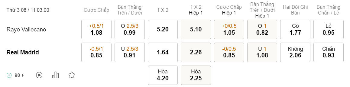 Soi kèo hiệp 1 Vallecano vs Real Madrid: 1.05*0/0.5*0.85