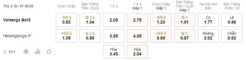Tỉ lệ kèo Varbergs vs Helsingborg