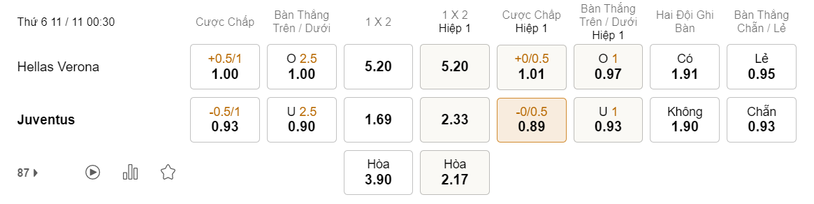 Soi kèo hiệp 1 Verona vs Juventus: 1.01*0/0.5*0.89