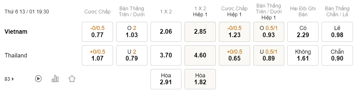 Tỉ lệ kèo Việt Nam vs Thái Lan