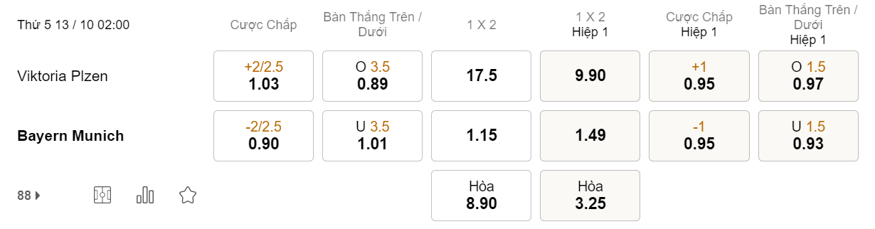 Soi kèo tài xỉu Viktoria Plzen vs Bayern: 0.89*3.5*1.01