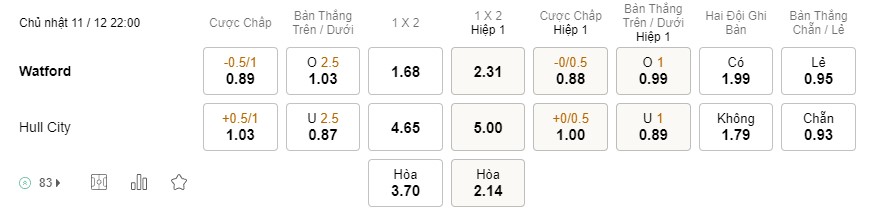 Soi kèo châu Á Watford vs Hull: 0.89*0.5/1*1.03