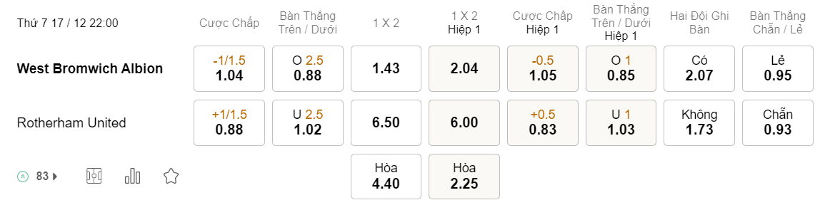 Soi kèo hiệp 1 West Brom vs Rotherham: 1.05*0.5*0.83