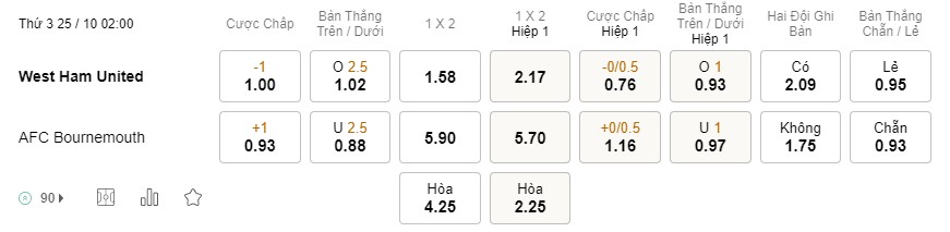 Soi kèo châu Á West Ham vs Bournemouth: 1.00*1*0.93