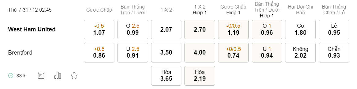 Soi kèo tài xỉu West Ham vs Brentford: 0.99*2.5*0.91