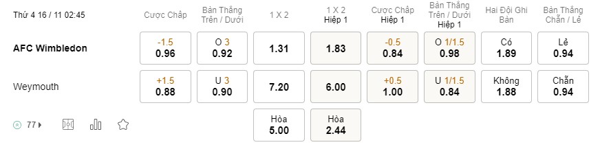 Tỉ lệ kèo Wimbledon vs Weymouth