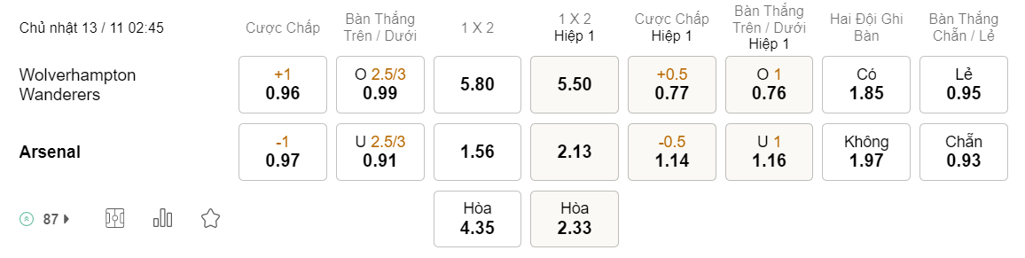 Soi kèo hiệp 1 Wolves vs Arsenal: 0.77*0.5*1.14